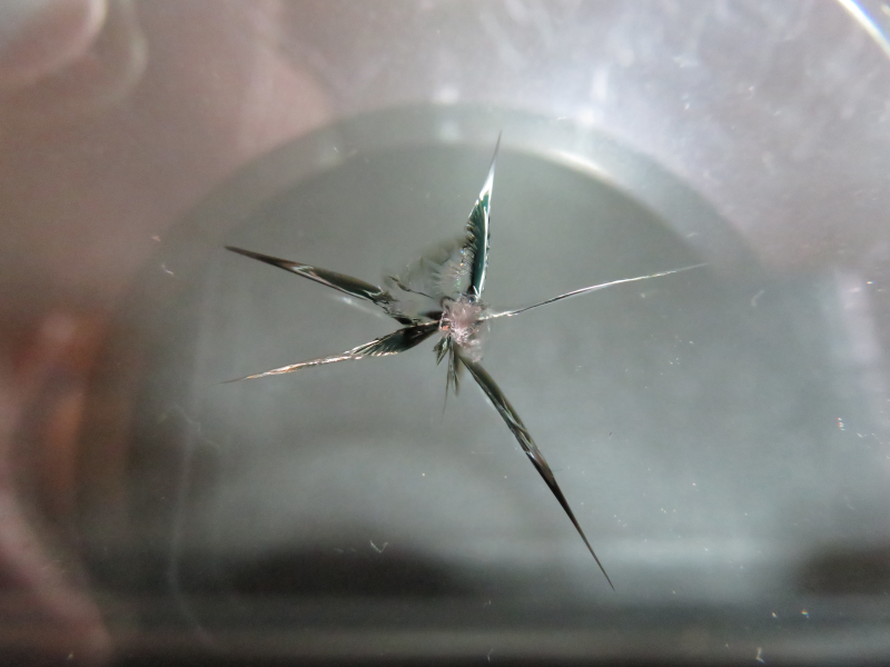 ヒビの位置はフロントガラス中央の下部で下から18cmの位置です。大きさは2.5cmほどです。放射状に鋭く伸びていて、放置してしまうと伸びる危険度の高いヒビです。