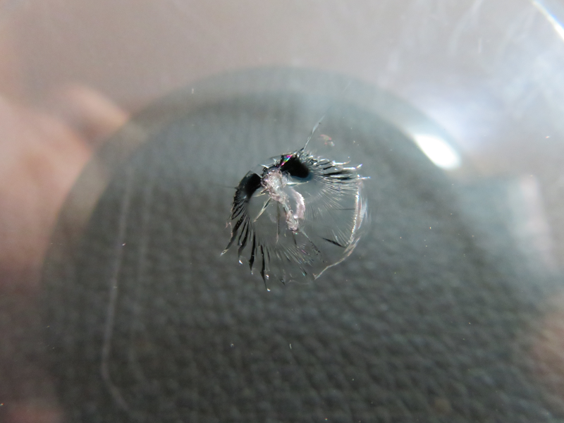 ヒビの位置は助手席側の下はじから11cmの位置です。大きさは1cmほどです。目玉ヒビに近い形をしています。