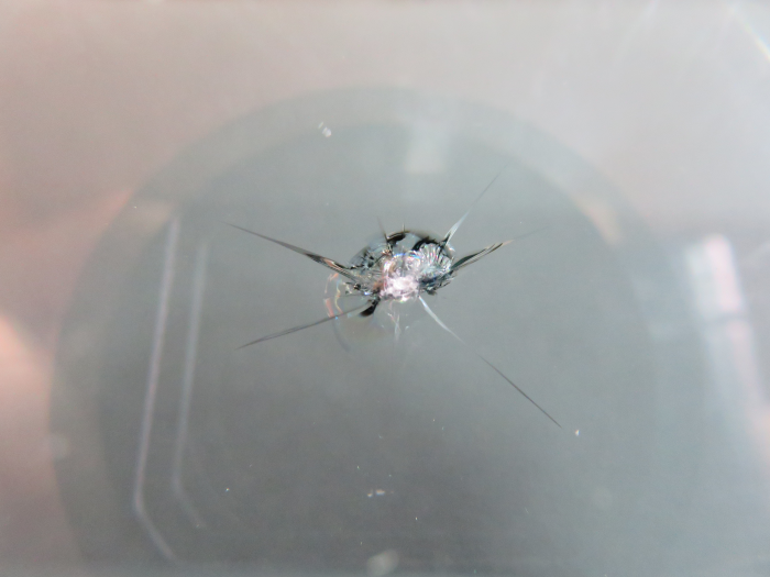 ヒビの位置は運転席側の下部です。大きさは2cmほどです。目玉ヒビの衝撃点から複数のスジ状のヒビが伸びています。下方向に伸びた長いヒビは伸びる危険度が高いので早めのリペアが大切です。