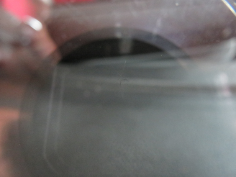 ヒビの位置はガラス中央の下方です。大きさは1.5cmほどで、三日月型のヒビからもう1本ヒビが伸びています。