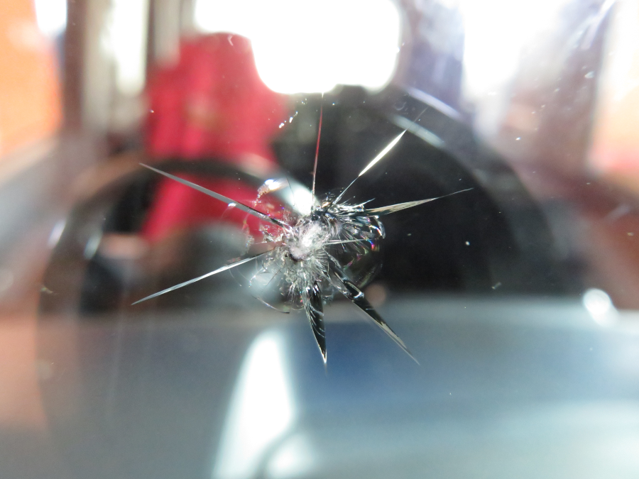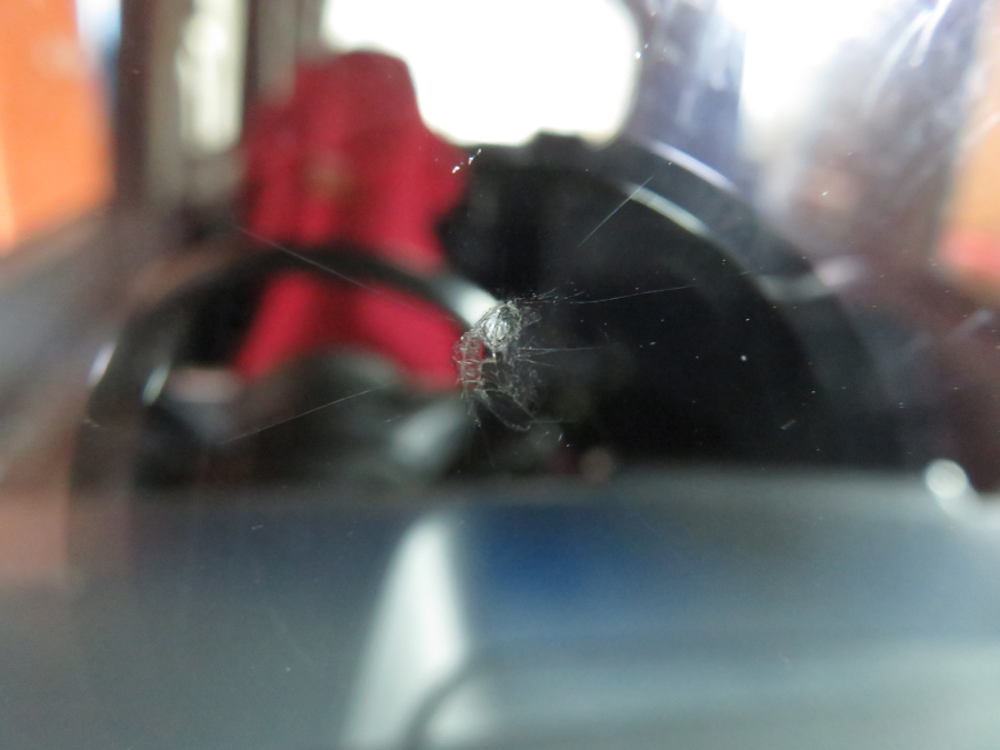 ヒビの位置は運転席正面で、大きさは3cmほどです。丸いヒビの衝撃点から数本のスジヒビが放射状に伸びています。リぺア可能な大きさギリギリです。