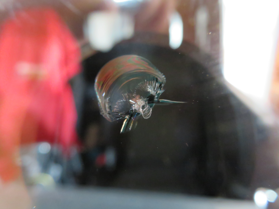 ヒビの位置は助手席正面で、大きさは1cmほどです。丸に近い扇型のヒビの衝撃点から2本ヒビが伸びています。